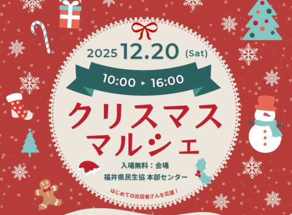 今年のクリスマスは、手作り品や美味しいフードが揃う「クリスマスマルシェ」へ! 生協は、このマルシェを通じて、組合員さんの活動や、初めて出店される方のチャレンジを応援しています。